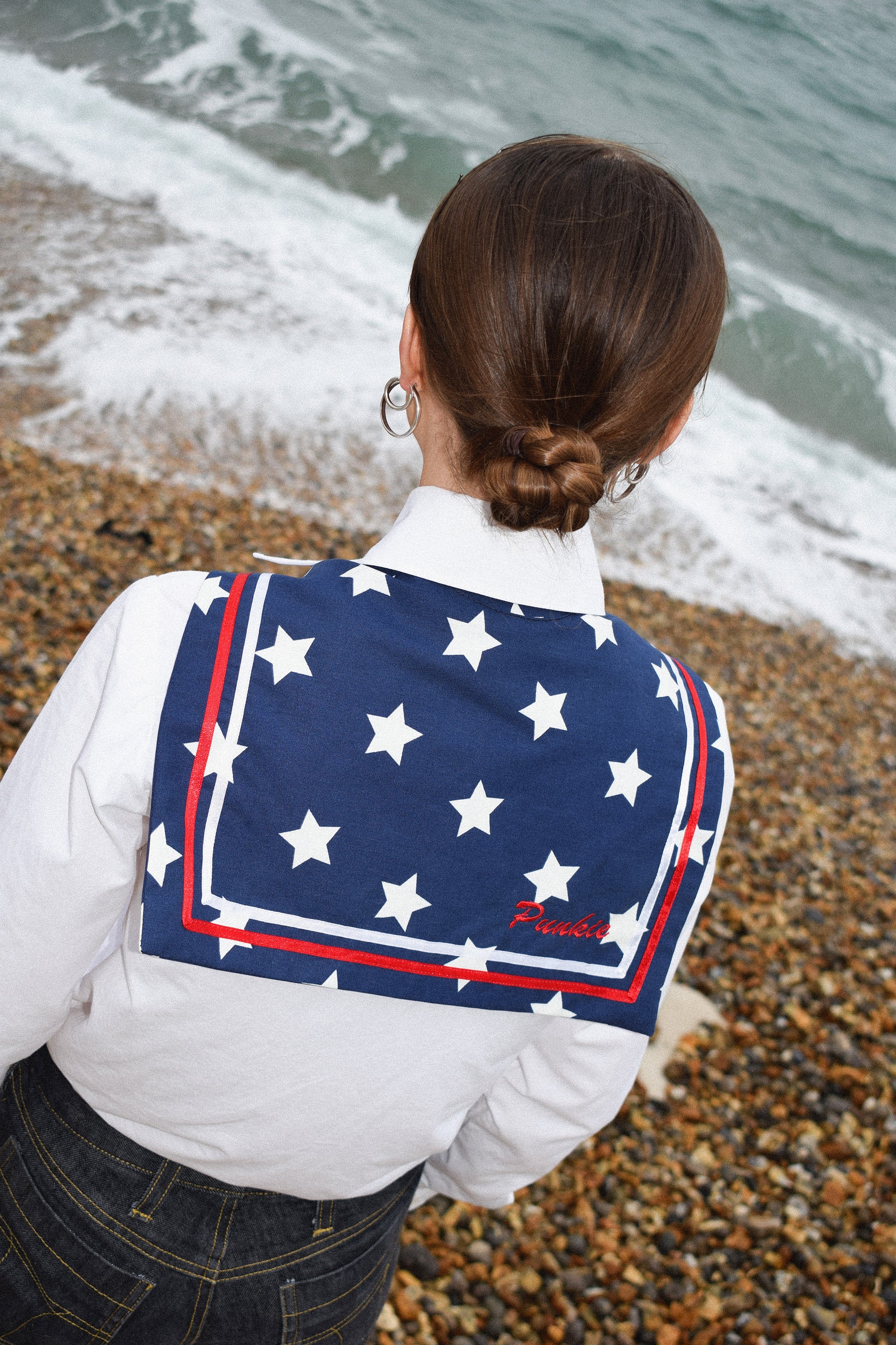 A detachable sailor collar handmade from upcycled cotton with ribbon trims and embroidered 'Punkie' logo on back. Press stud fastening on front ties for easy wear.